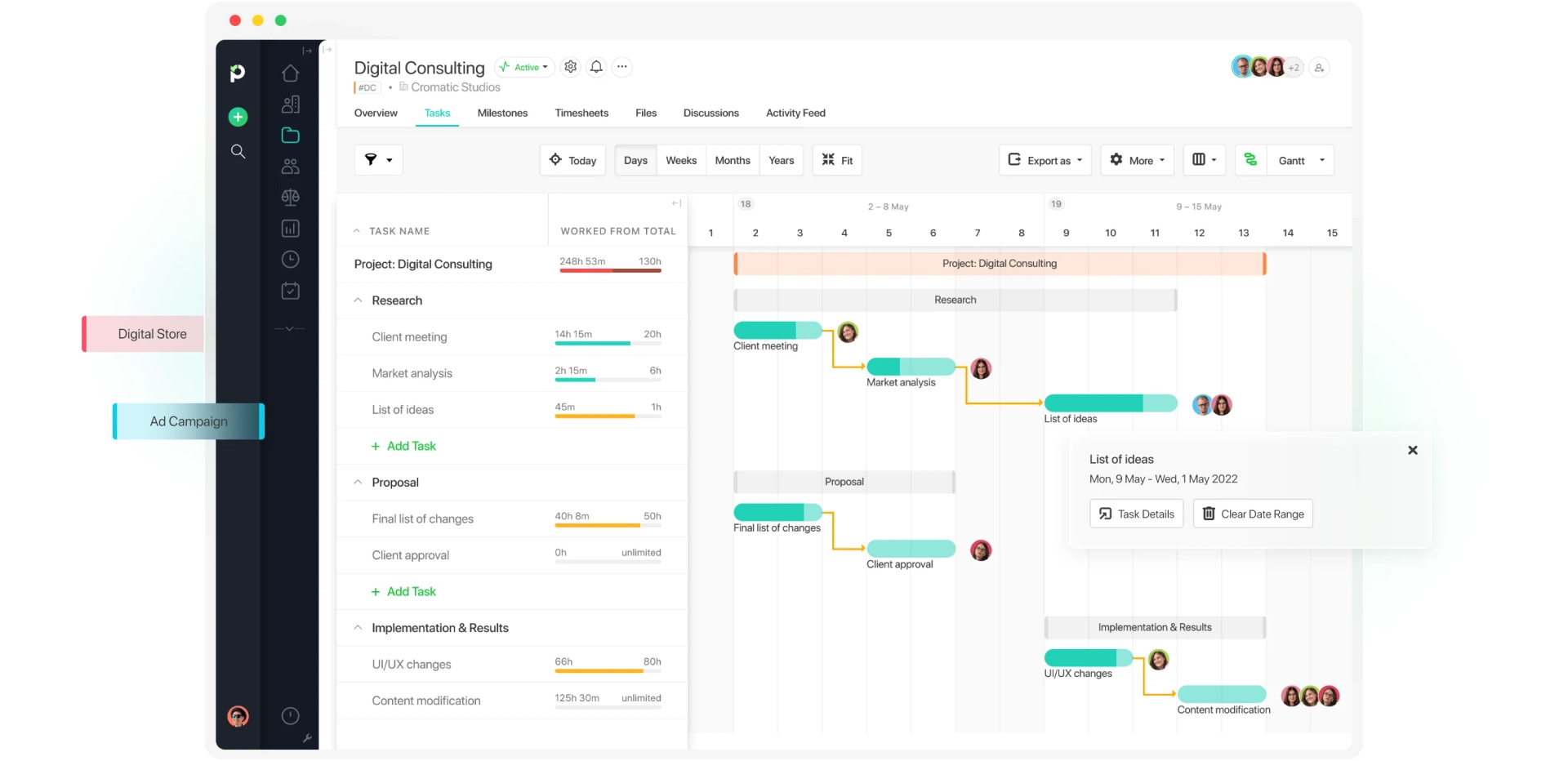 You’ve got a “who-does-what-and-when” visualization so that the employee schedule and the project timeline run synchronously, and there’s no overlapping of employees or tasks.