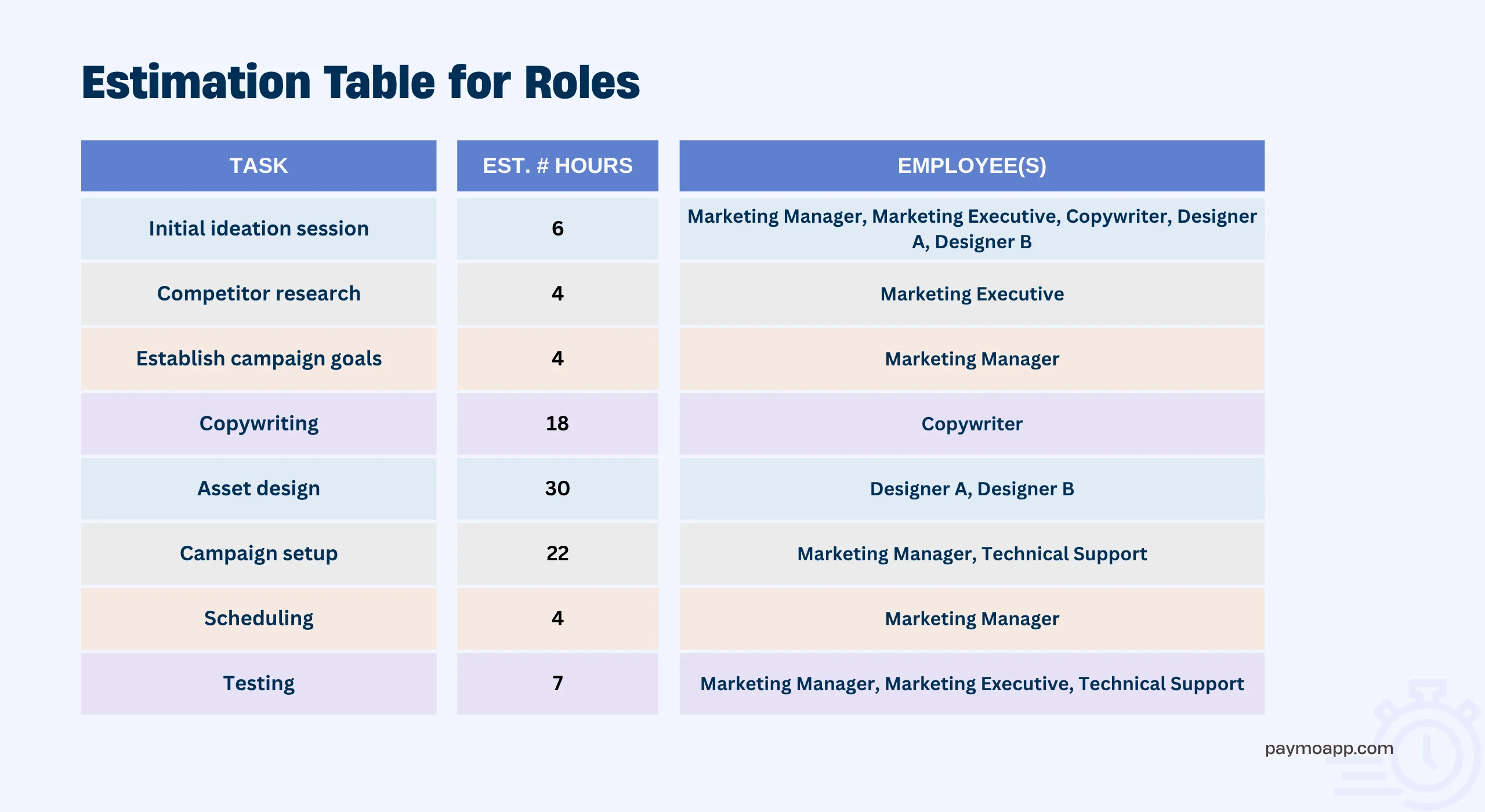 To make the time estimates as accurate as possible, consider the timelines of previous campaigns and consult with the team members who will be actively involved in the work’s execution.